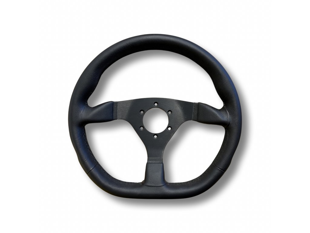 Kvalitní sportovní volant Vestena Racing 9 s průměrem 350 mm z hladké černé kůže. Dolní strana volantu zploštělá.